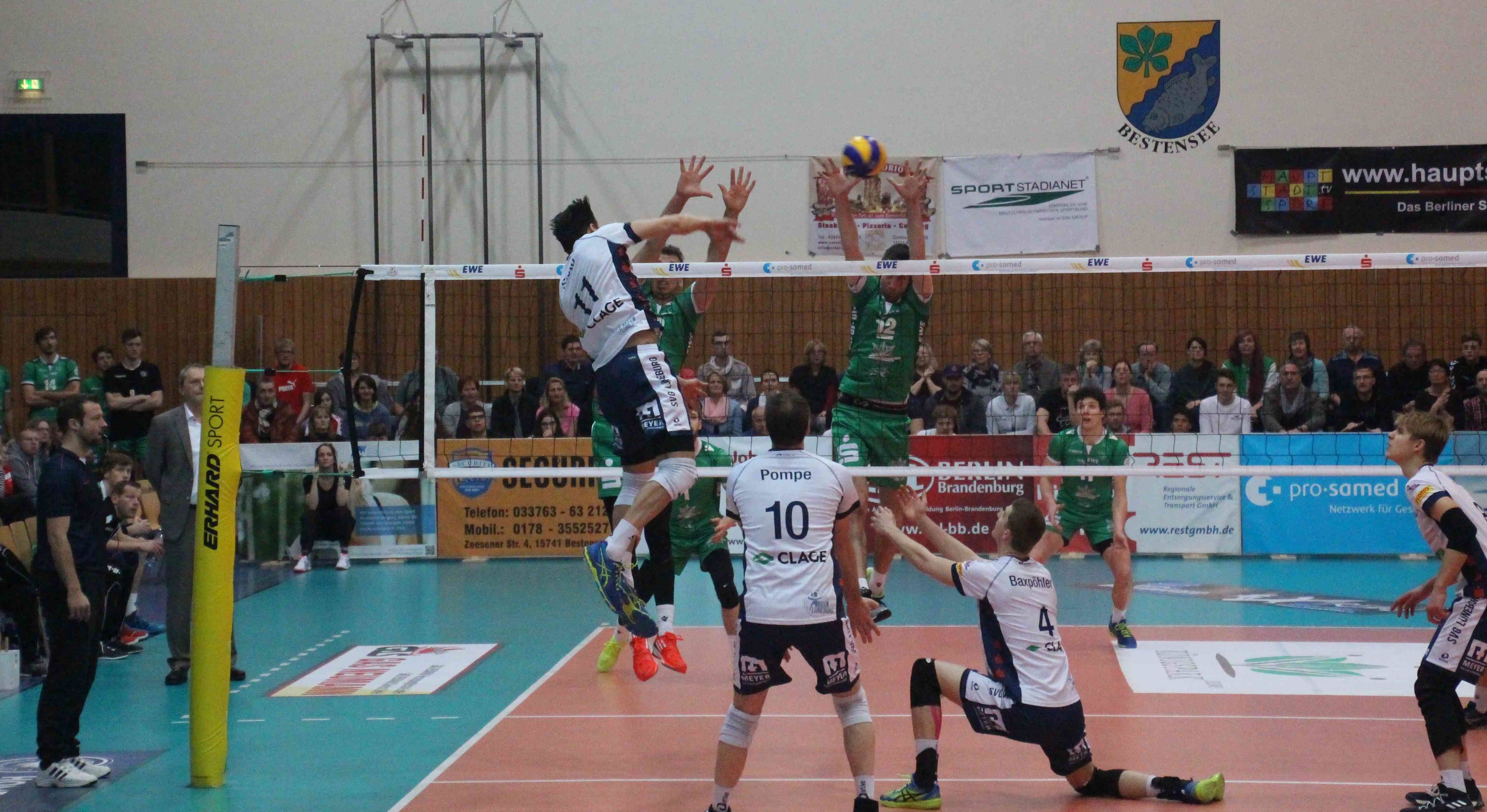 Aller verrückten Dinge sind drei: Schon wieder mussten die LüneHünen in den Tiebreak, zum dritten Mal in Serie und innerhalb von nur zehn Tagen über fünf umkämpfte Sätze gehen. Statt bei einem Gegner im Niemandsland der Tabelle einfach mal wieder einen Drei-Punkte-Sieg zu landen, hieß es im letzten Auswärtsspiel der Bundesliga-Hauptrunde 3:2 (25:13, 19:25, 25:22, 25:27, 15:10) bei den Netzhoppers Königs Wusterhausen (KW) im brandenburgischen Bestensee.